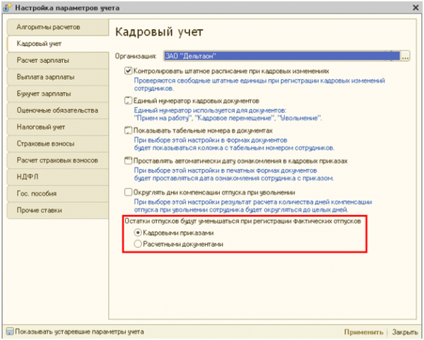 Настройка учета остатков осуществляется в меню "Сервис" - "Параметры учета" - "Кадровый учет".