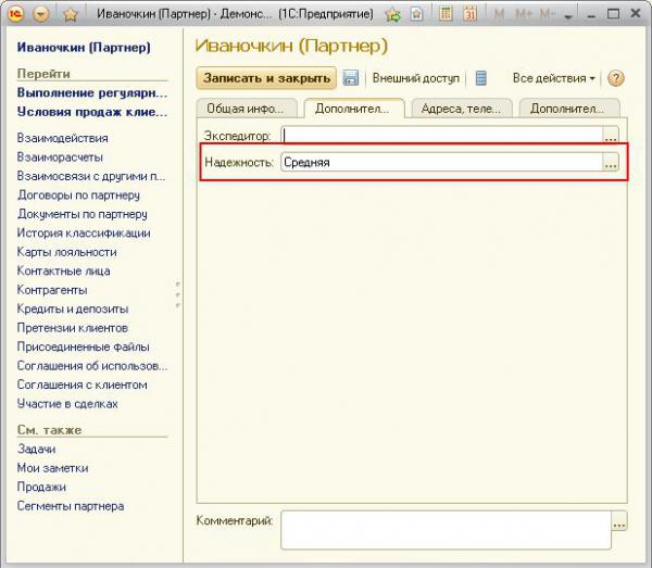 Заходим в карточку клиента и на закладке «Дополнительно» указываем его надежность.