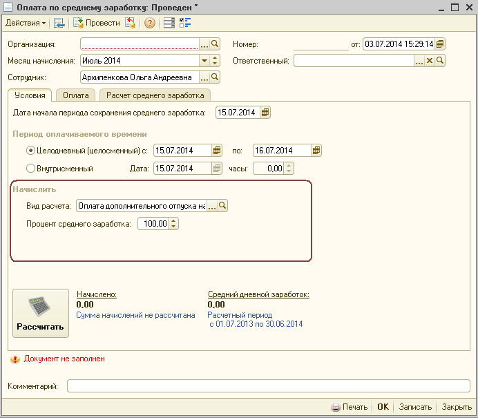 2. Документом "Оплата по среднему заработку" оформить этот отпуск. Это документ начислений.