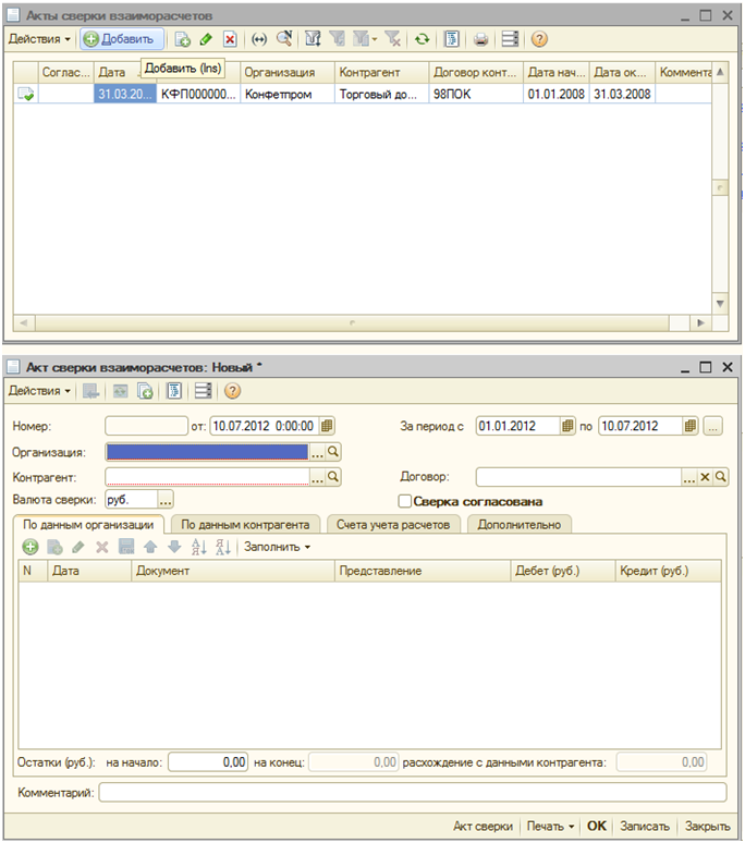 Если сверка производится в рублях, при автоматическом заполнении в табличную часть попадут данные обо всех расчетах с контрагентом, вне зависимости от валюты расчетов, указанной в договоре. В том случае, если сверка производится в валюте, в табличную часть попадают только операции в указанной валюте (при условии, что эта валюта указана в договоре с контрагентом в качестве валюты расчетов).